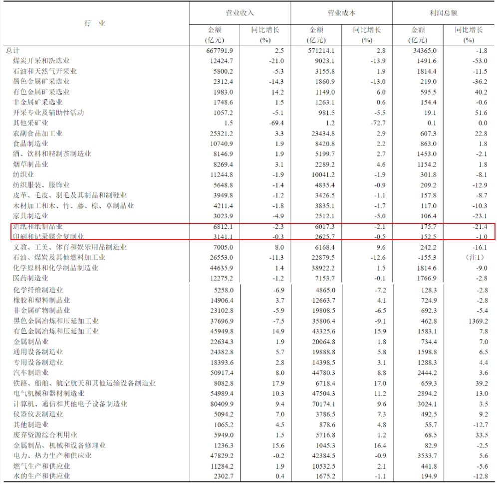 在營(yíng)業(yè)收入方面,規(guī)模以上工業(yè)企業(yè)實(shí)現(xiàn)營(yíng)業(yè)收入66.78萬(wàn)億元,同比增長(zhǎng)2.5%。其中,造紙和紙制品業(yè)實(shí)現(xiàn)營(yíng)業(yè)收入6812.1億元,同比下降2.3%;印刷和記錄媒介復(fù)制業(yè)實(shí)現(xiàn)營(yíng)業(yè)收入3141.1億元,同比下降0.3%。
